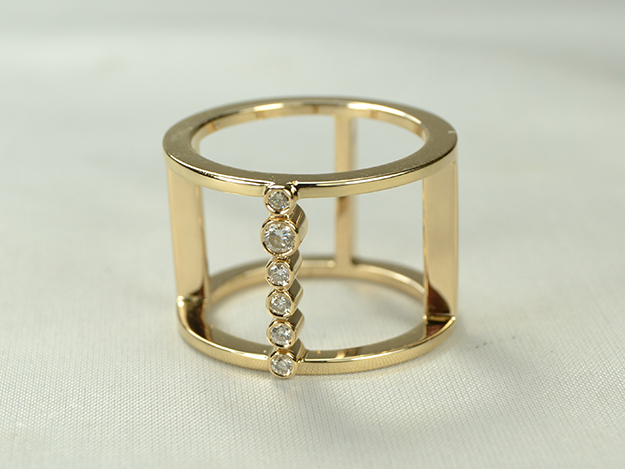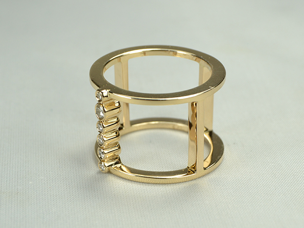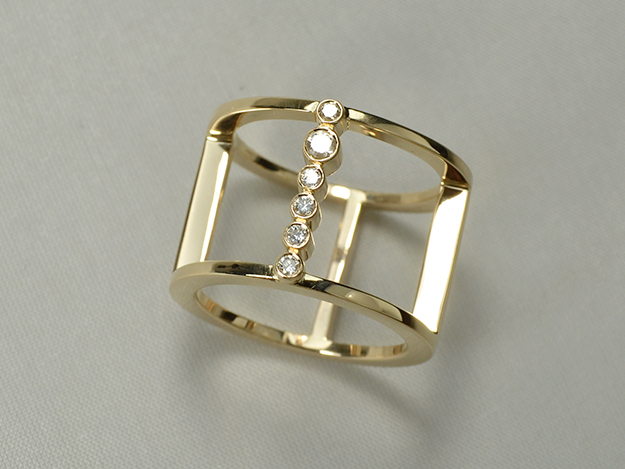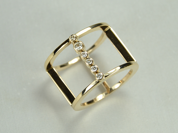 Ring in 585/000 Roségold, mit Brillanten in Zargenfassungen, 2 weit auseinanderliegende, schmale Schienen, die mit Stegen miteinander verbunden sind.