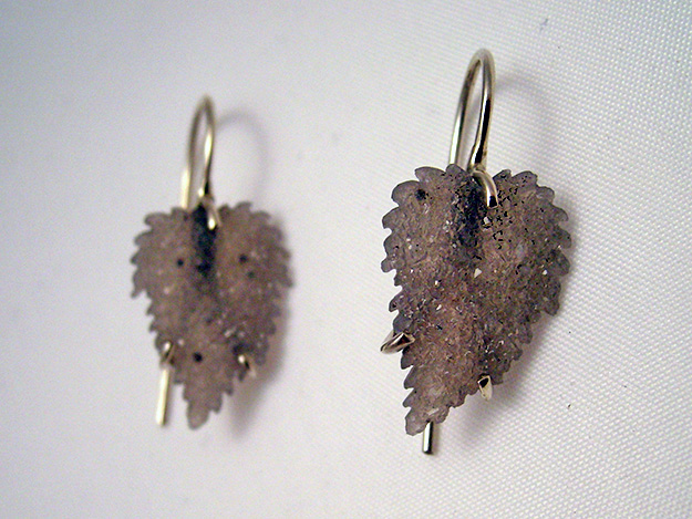 Kristallisierte Achatblätter, grau mit schwarzen Sprenklen, mit Schweizerhaken, Silber, Länge 15mm.