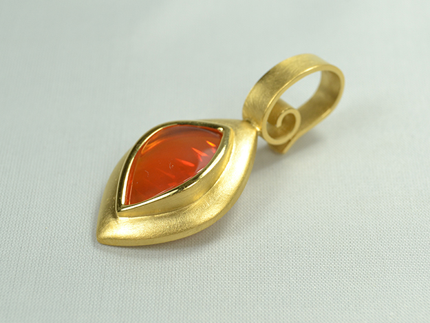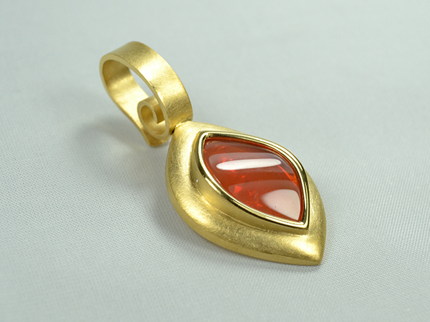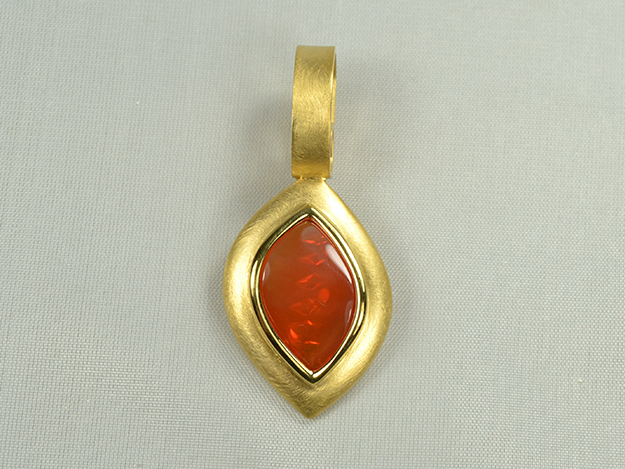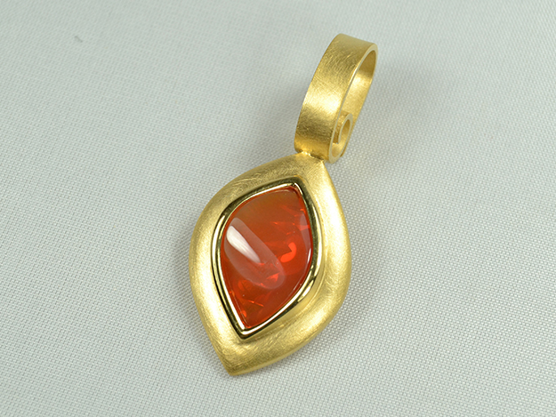 Feueropal im Phantasieschliff mit angepasster Fassung aus Silber, feingoldplattiert.