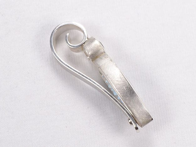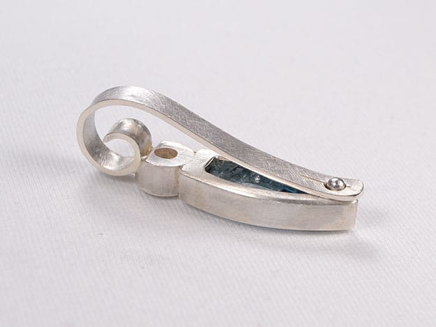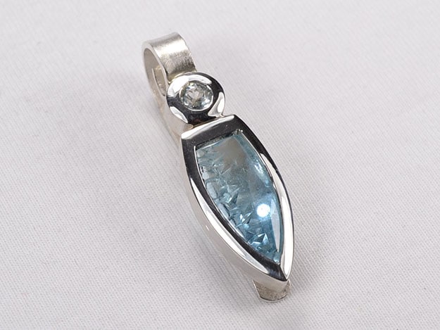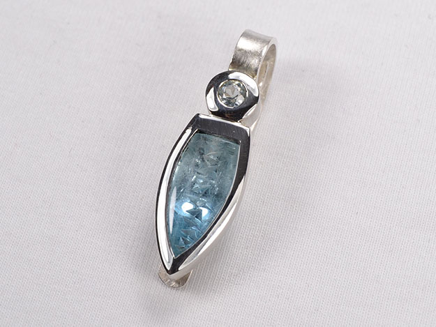 Massiv gearbeiteter Anhänger in Silber, in den vorhandene Aquamarine verarbeitet wurden. Unten ein Aquamarin im Sonderschliff und oben ein runder, heller Aqua.