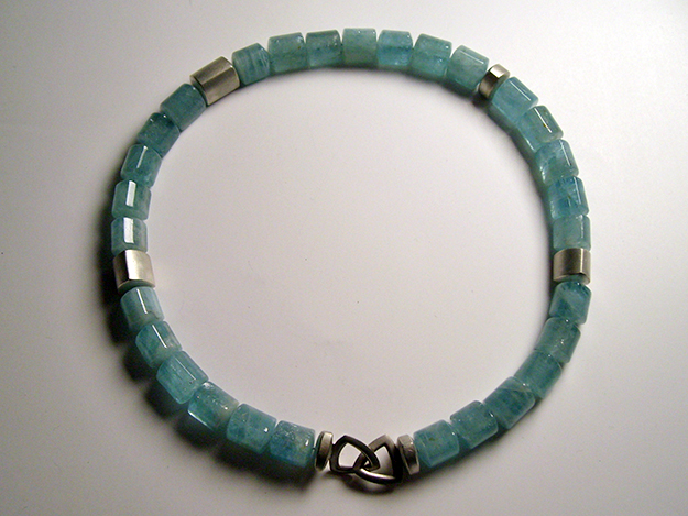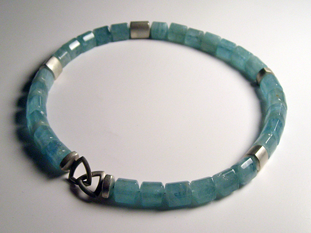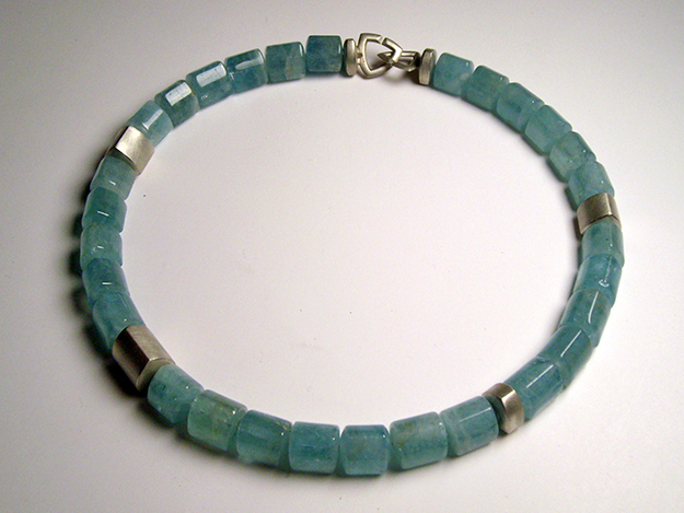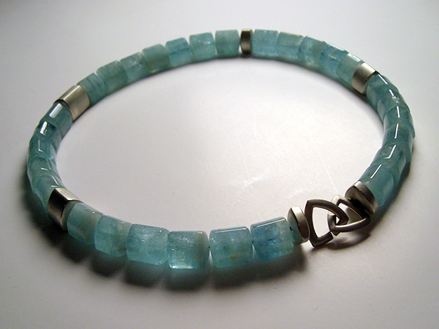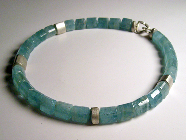 Dreikantige Aquamarinstücke mit Zwischenteilen und Schließe in Silber.