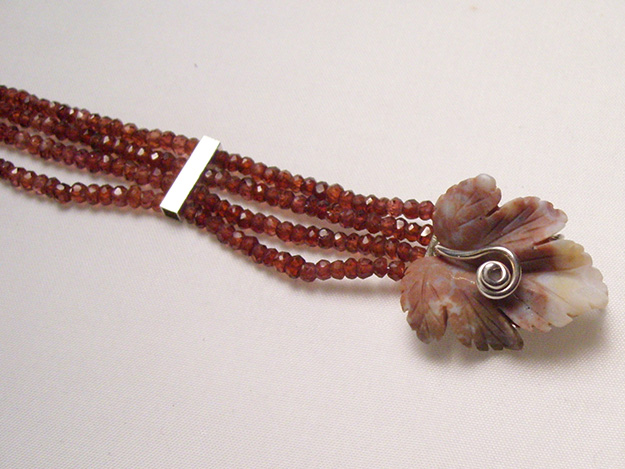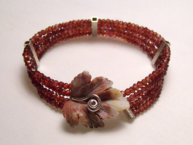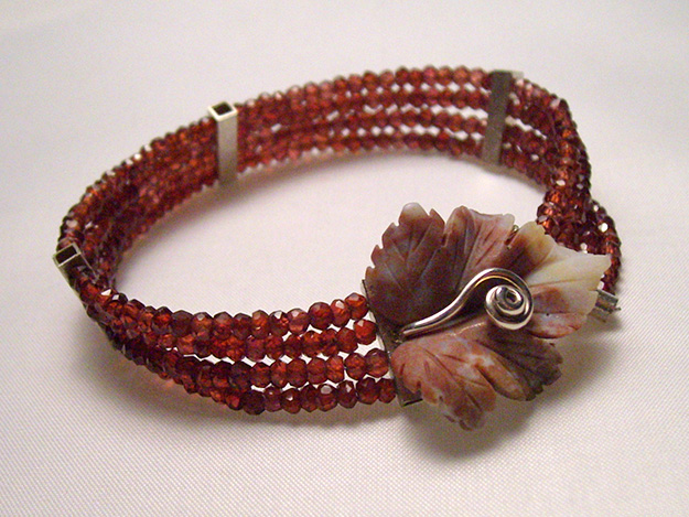 Vierreihiges Armband aus Granatsträngen mit Schließe und Zwischenteilen aus 925/000 Silber, eingearbeitetes Blatt aus Jaspis.
