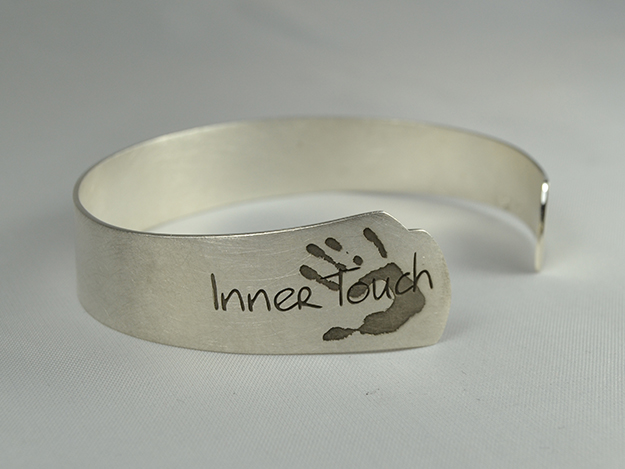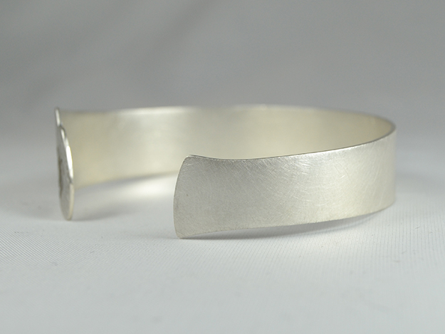 Armspange in 925/000 Silber mit lasergraviertem Logo. Seitliche Öffnung zum Reinschlüpfen.