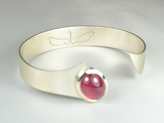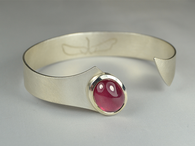 Armspange in 925/000 Silber, Öffnung seitlich., mit Rubin-Cabochon und „Nasen-Gravur“