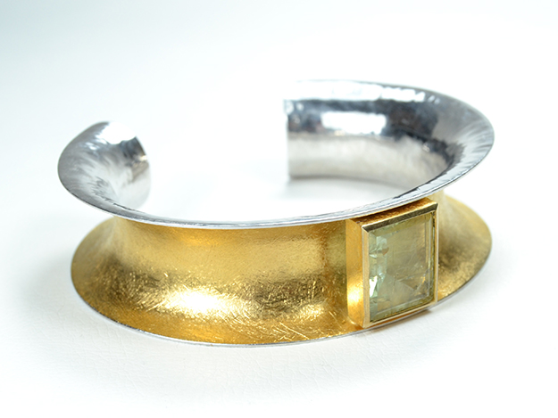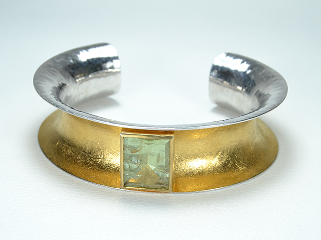 Breiter, antiklastisch geschmiedeter Armreif, zum Teil feingoldplattiert, mittig Fassung für grünen Beryll.