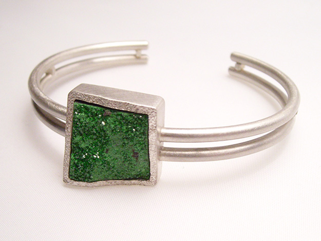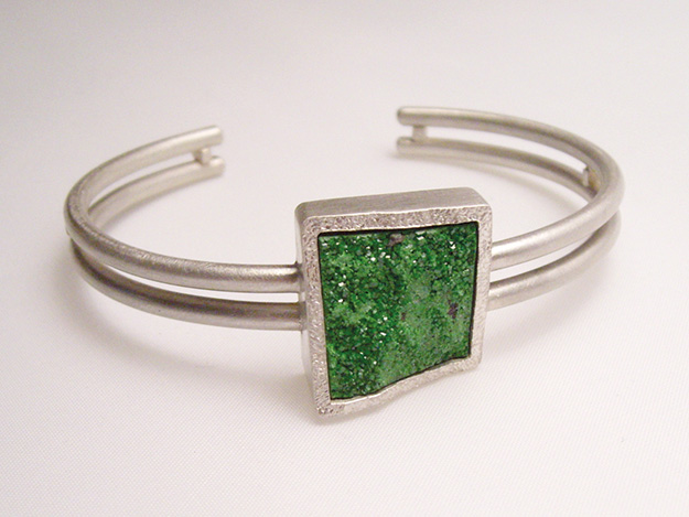 Aus zwei Runddrähten geformte Armspange, Öffnung unten, mit breiter Fassung für einen Uwarowit, der zu der Famielie der Granate zählt.
