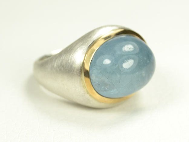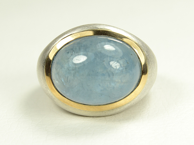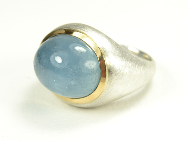 Sehr breiter Bandring in Silber, aufgesetzte ZArgenfassung für ein Aquamarin-Cabochon.