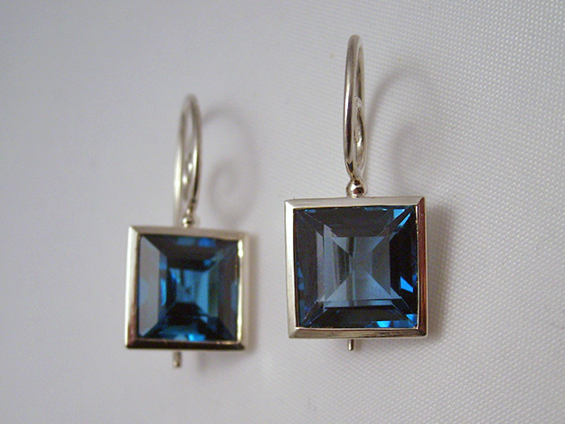 Facettierte Topas-Carrés, in Silberfassung an doppelt geschwungenenm Schweizer Haken, Länge 19mm.