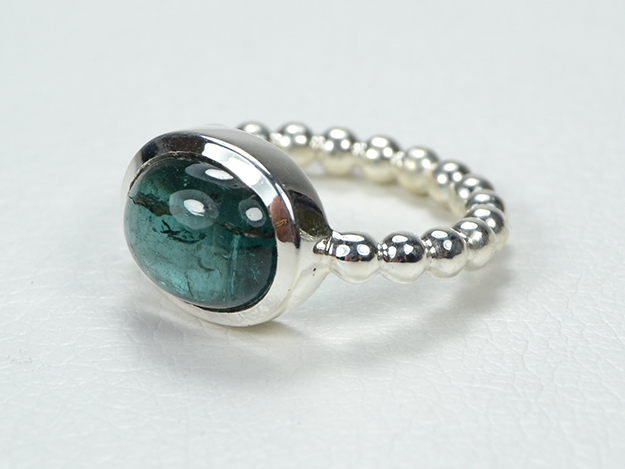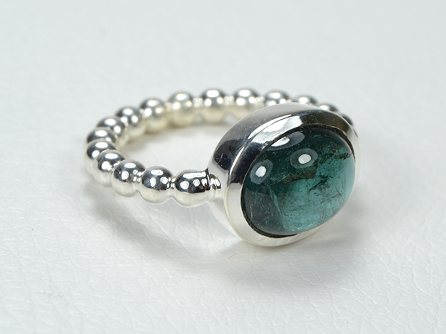 Dickerer Perldrahtring in Silber mit Zargenfassung für Turmalin-Cabochon.