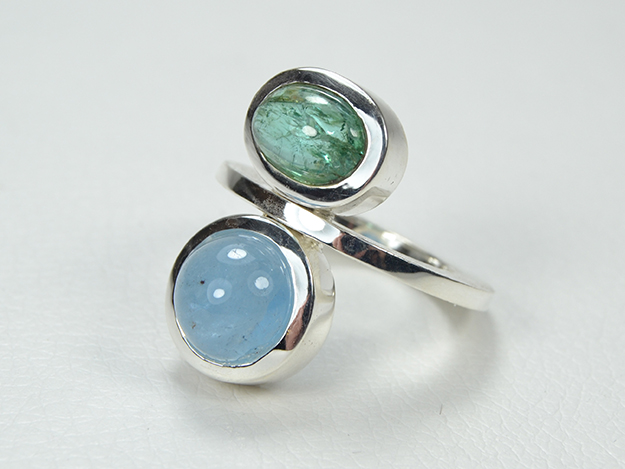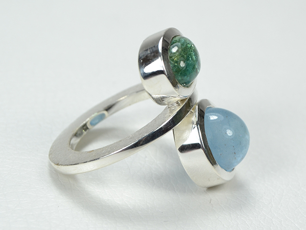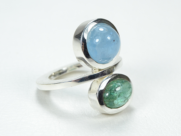 Scheibenförmige Ringschiene mit angesetzten Zargenfassungen für ein Aquamarin- und ein Turmalin-Cabochon; Silber.