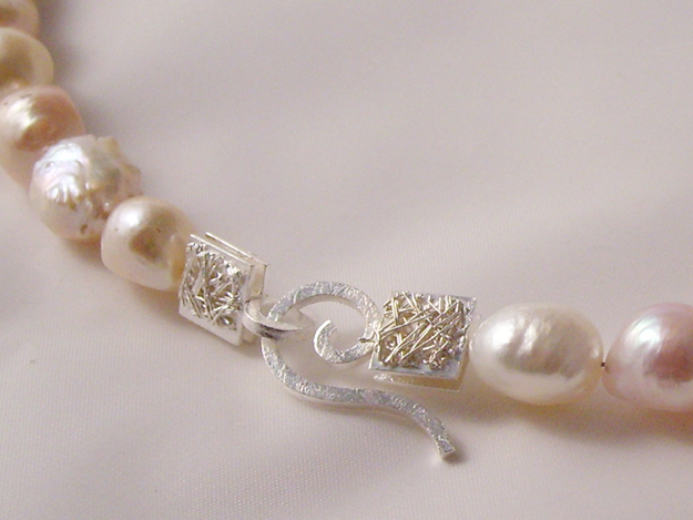 Mehrfarbige Süßwasserzuchtperlenkette mit Zwischenteilen und Schließe in Silber, mit Fasermatte belötet.