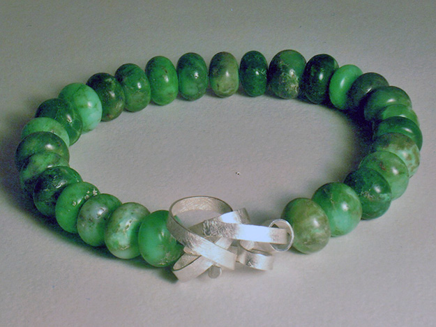 Dicke Chrysoprasrondelle mit gewundener Schließe in Silber.