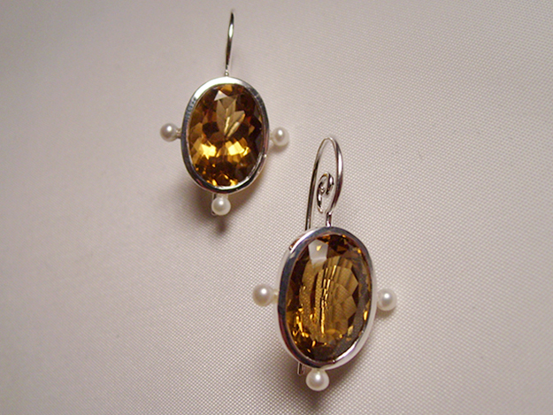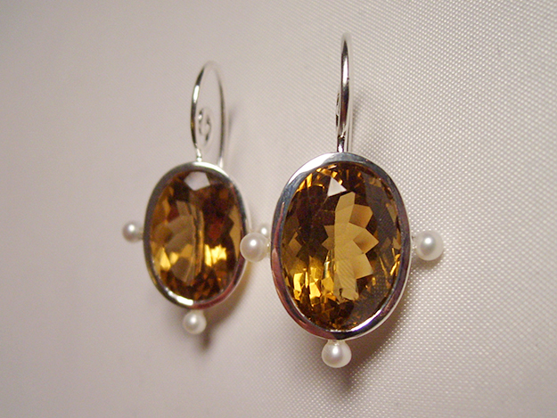 Facettierte, ovale Citrine mit kleinen Süßwasserzuchtperlen, Silberfassung, doppelt geschwungener Schweizer Haken, Länge 28mm.