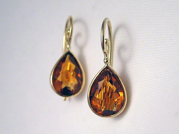 Facettierte, tropfenförmige Citrine in 585/000 Gelbgoldfassung mit doppelt geschwungenem Schweizer Haken, Länge 18mm.