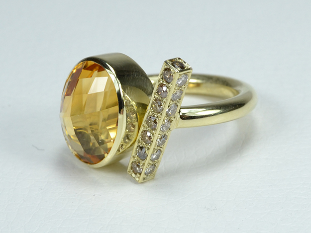 Runddrahtschiene mit angesetzter Zargenfassung für einen Citrin und angestztem Stäbchen, das mit 20 cognacfarbenen Brillanten besetzt ist.