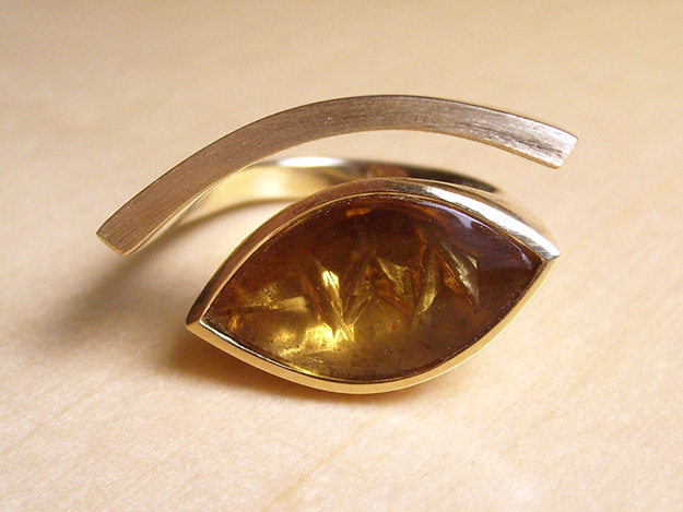 Offen gearbeiteter Gelbgoldring für einen Citrin im Phantasieschliff.
