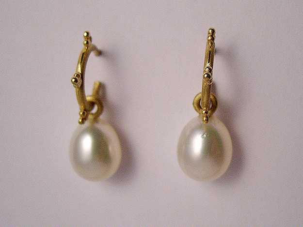 Süßwasserzuchtperlen in Tropfenform an Creolen/Stecker mit Kügelchen in 585/000 Gelbgold Länge 16mm.