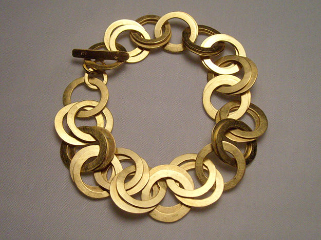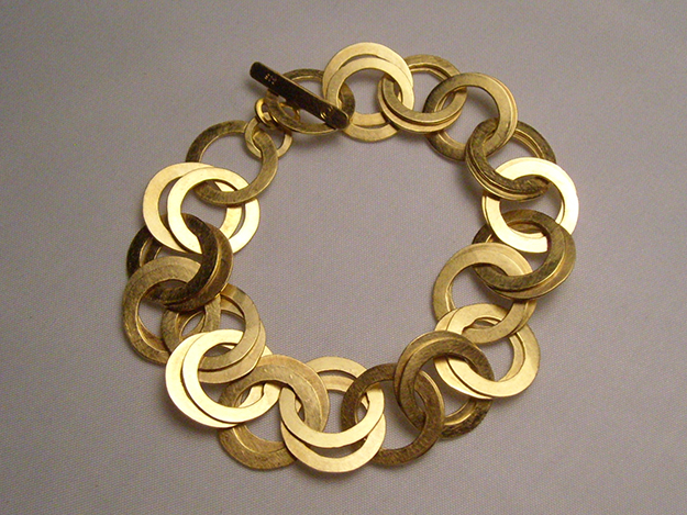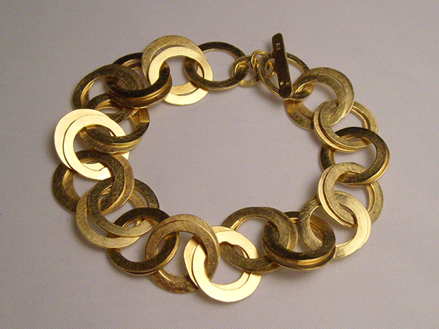 Armband aus handgeschmiedeten, doppelt gehängten Ösen in 925/000 Silber, feingoldplattiert mit Knebelverschluss.
