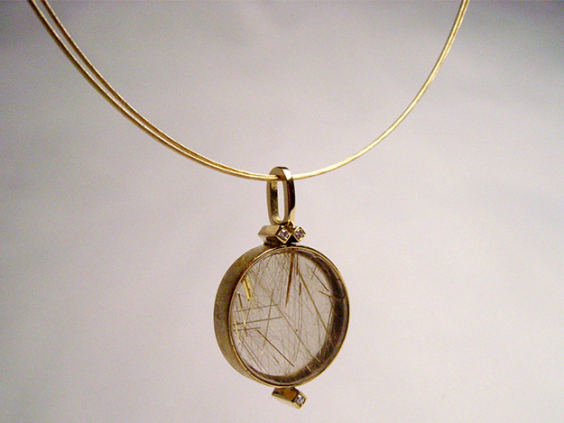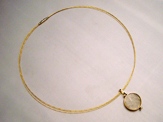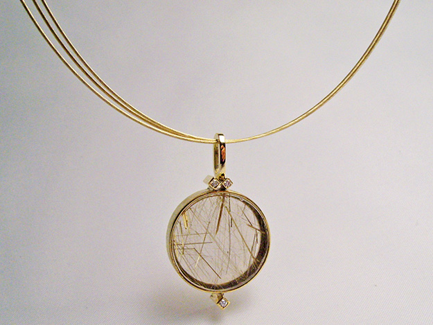 Dreireihiger Halsreif mit Anhänger in 585/000 Gelbgold, Bergkristall mit Engelshaar und Brillanten.