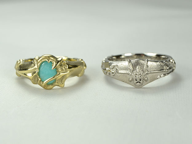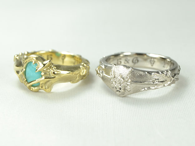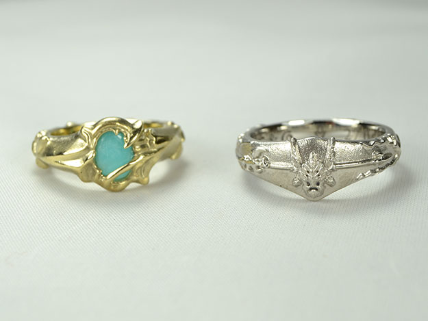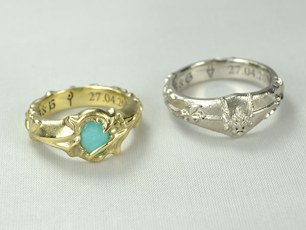 Völlig individuelle Ringe aus Formdetails einzelner Game-Figuren gestaltet und zu einem Trauringpaar kreiert. Herrenring in 950/000 Platin un Damenring in 585/000 Gelbgold mit Amazonit-Cabochon.
