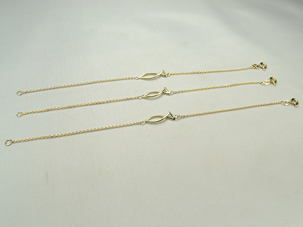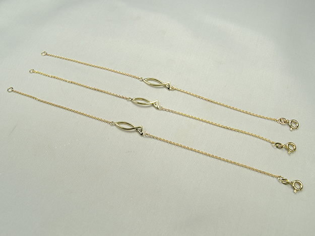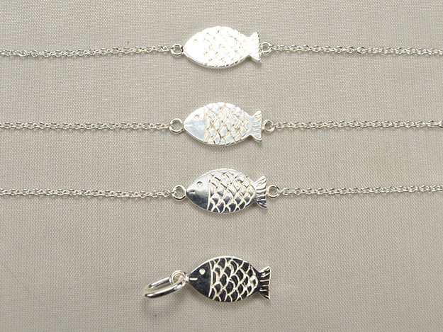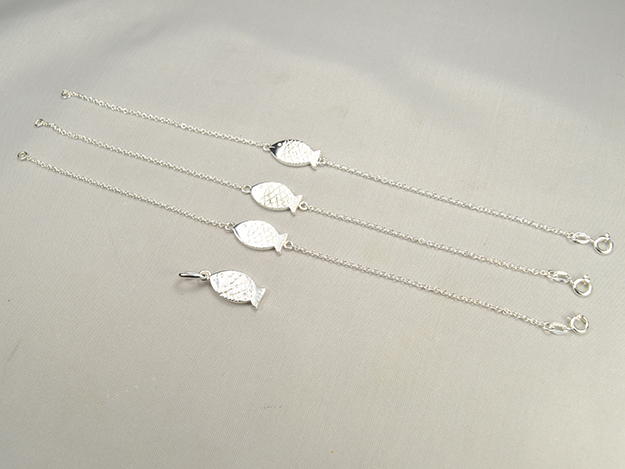 Armbänder mit verschiedenen Fischdarstellungen in 925/000 Silber un 333/000 Gelbgold für die Gruppe „fish and chicks“.