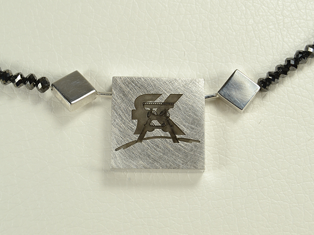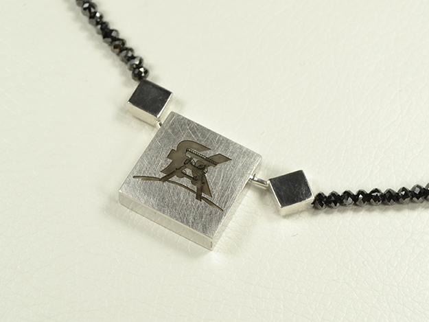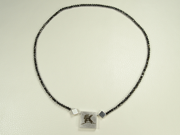 Schwarze Rohdiamantkette mit Schließe in Silber, auf der ein Logo lasergraviert ist. Bitte Vergrößern, die Gravur ist sehr fein!