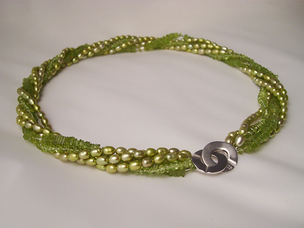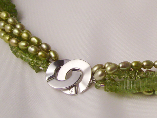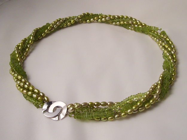 Fünfreihige Kette mit grünen Süßwasserzuchtperlen, Peridotrondelle und-scheiben, Schließe in Silber.