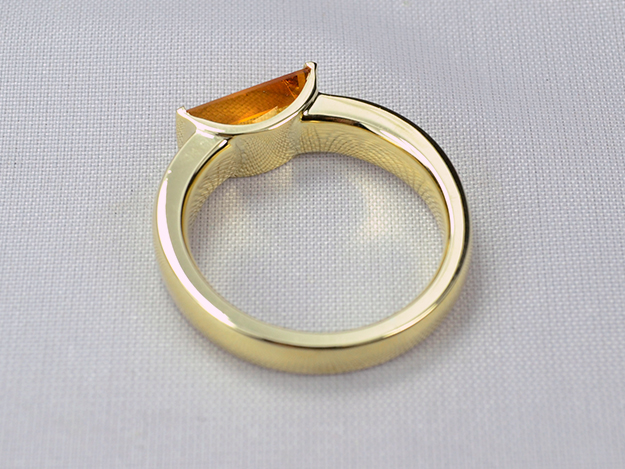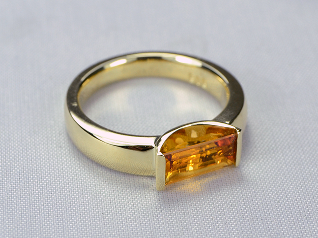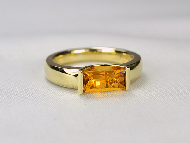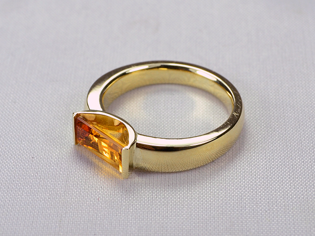 Bandring mit aufgelötetem Halbkreis, in dem ein rechteckiger Citrin gehalten wird.