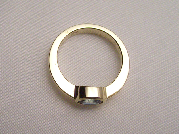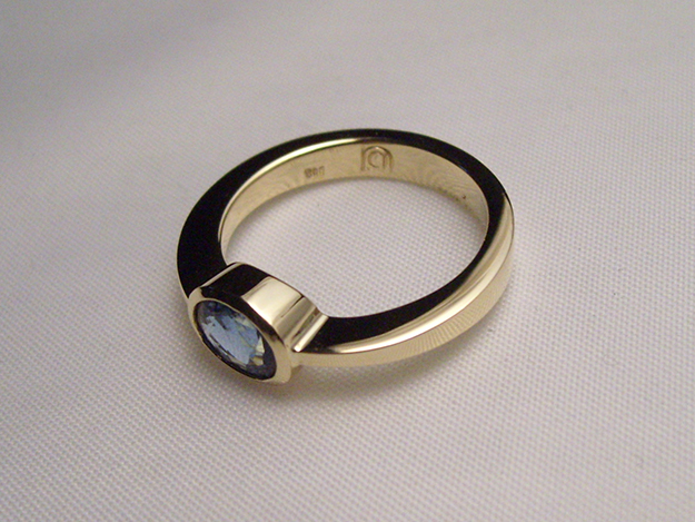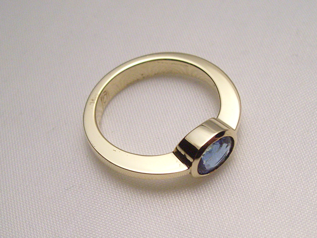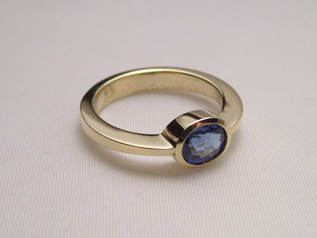 Gelbgoldene Zungenschiene mit Zargenfassung für facettierten Saphir.