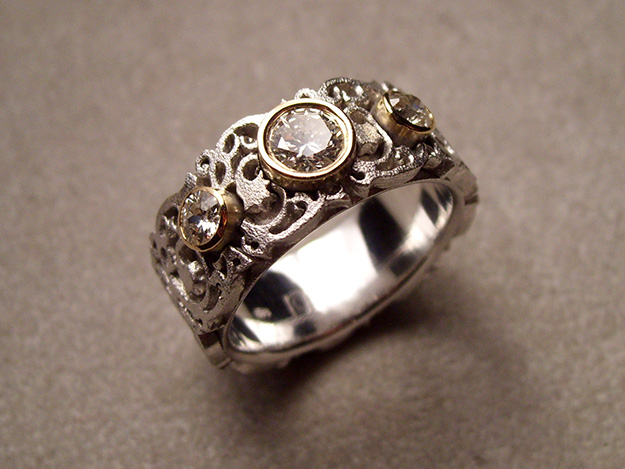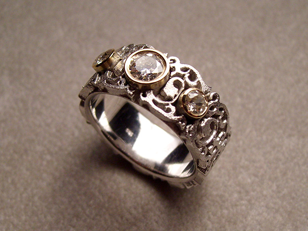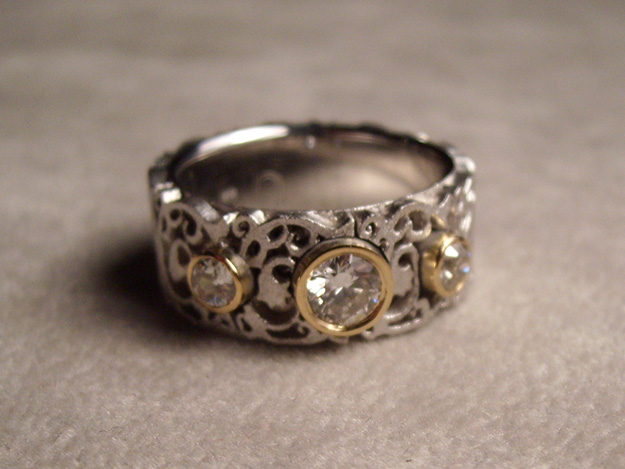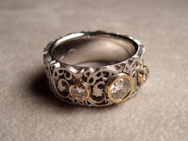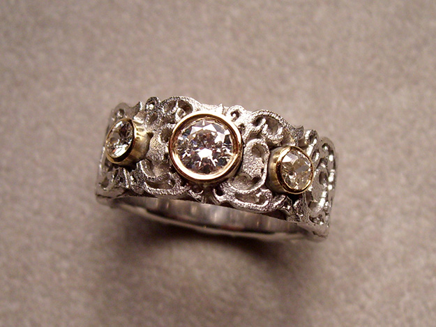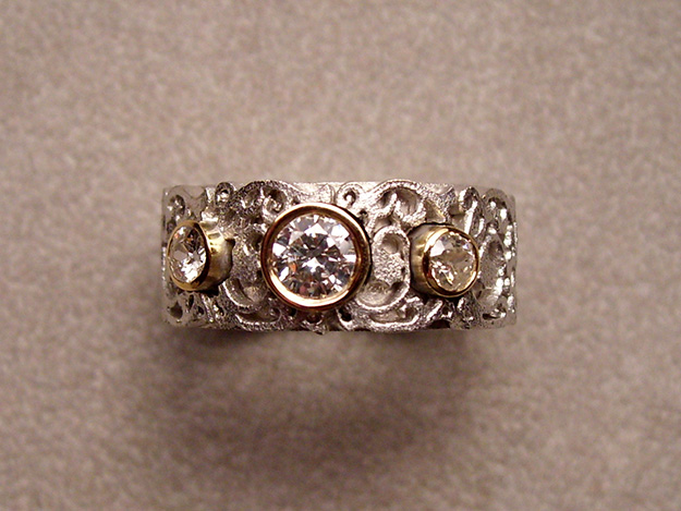 Ring mit gesägtem Muster in Weißgold, aufgesetzte Roségoldfassungen für Kundensteine.