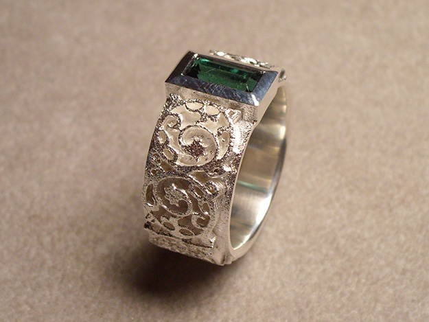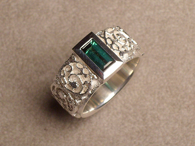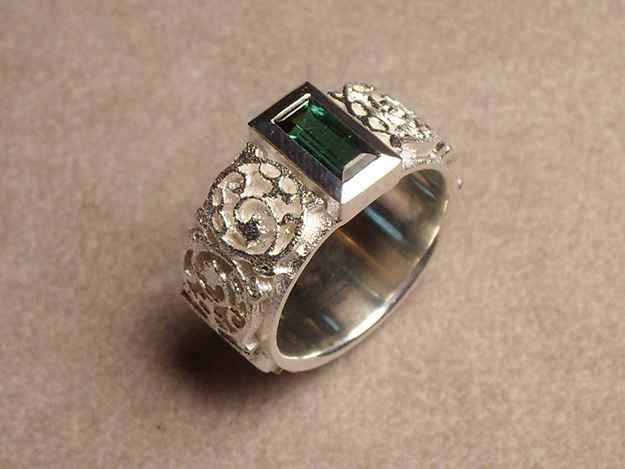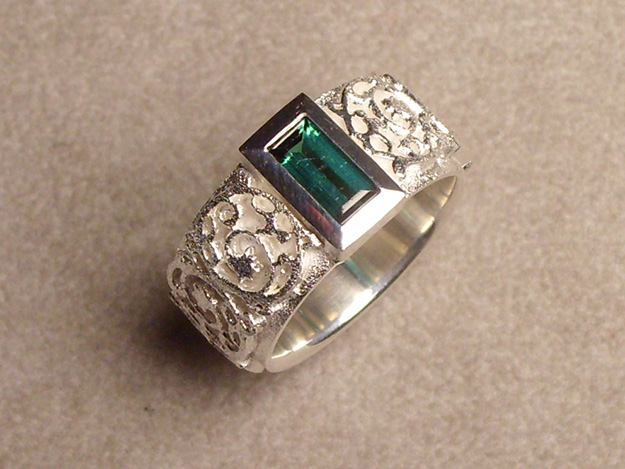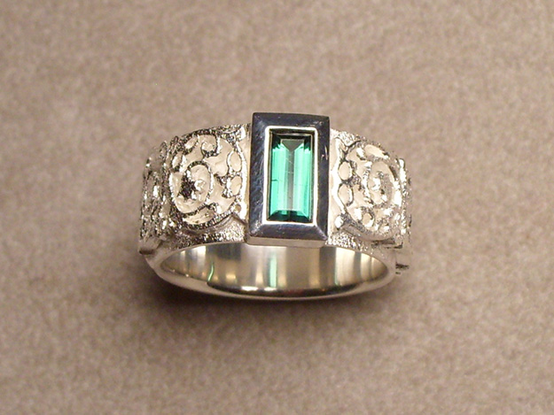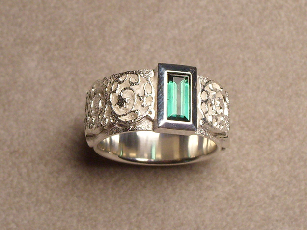 Silberring mit gesägtem Muster mit Fassung für rechteckigen, grünen Turmalin.