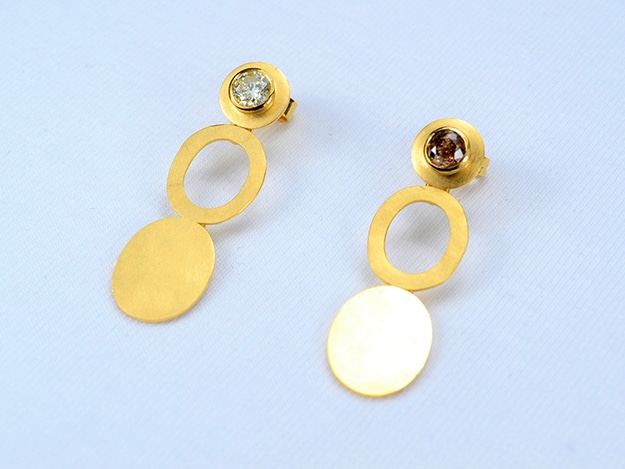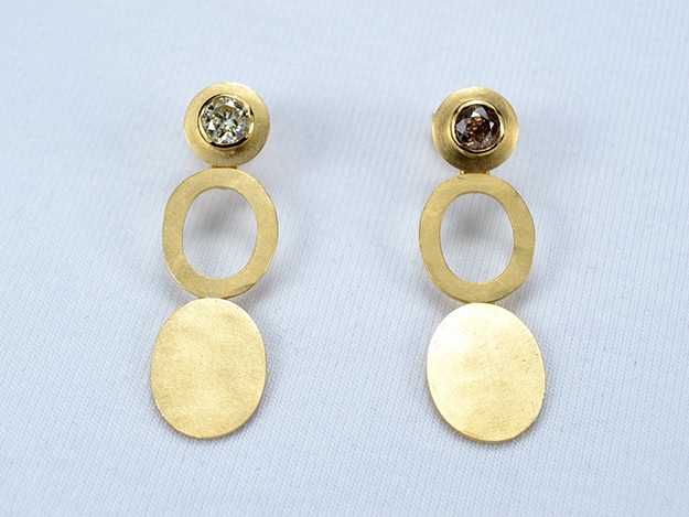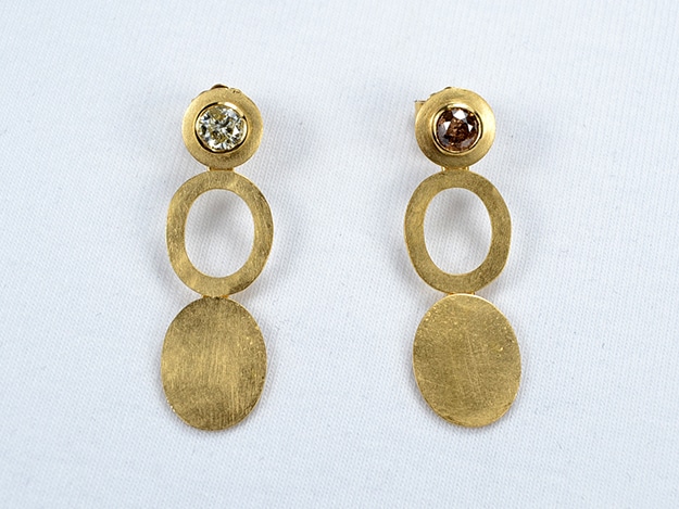 Geschmiedete Platte und Ösen, die beweglich miteinander verbunden sind. Mit kundeneigenen, braunem und gelblichem Brillant.