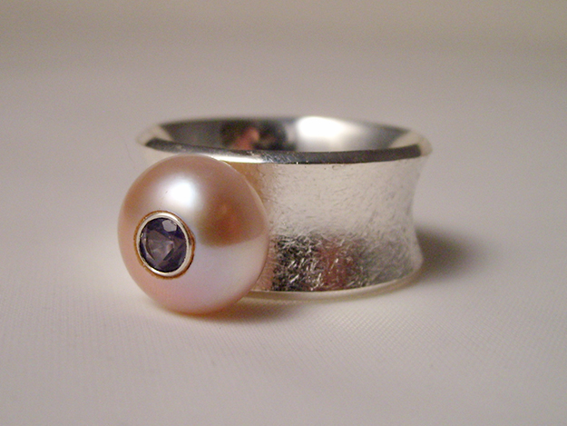 Gewölbter Ring mit Perle und Iolith