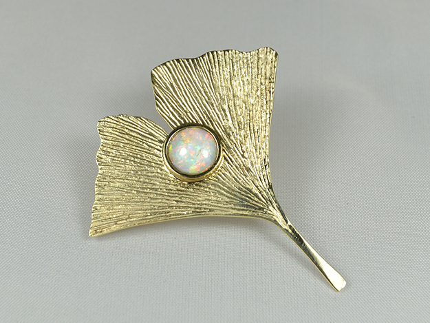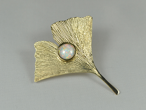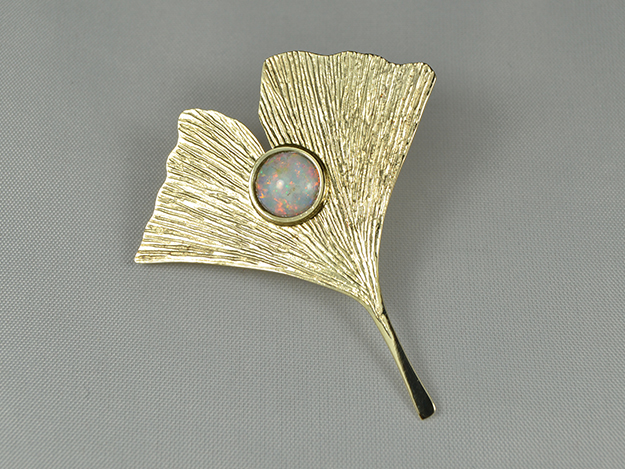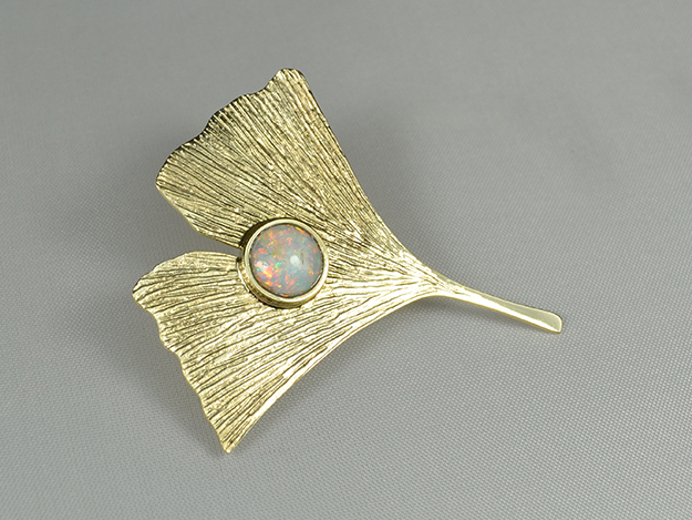 Brosche in Form eines Gingkoblattes in 585/000 Gelbgold mit kundeneigenem Opal mittig.