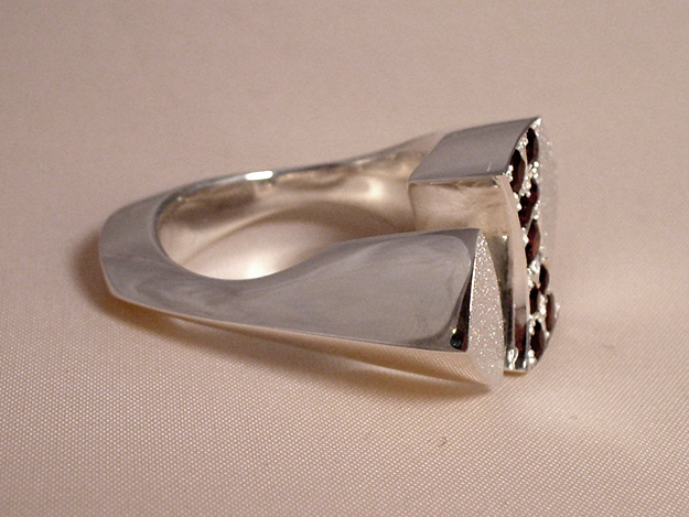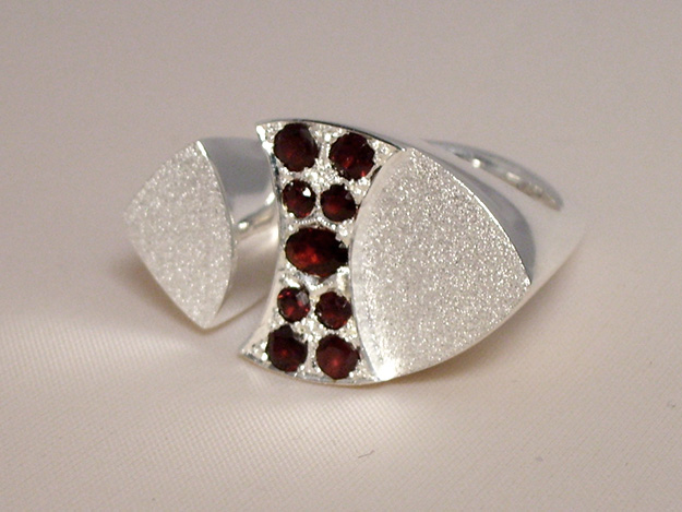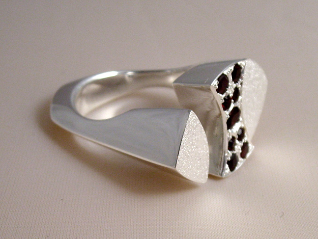 Offen gearbeiteter, sehr großer Silberring mit einem pavégefassten Kundensteinen.