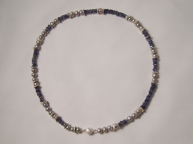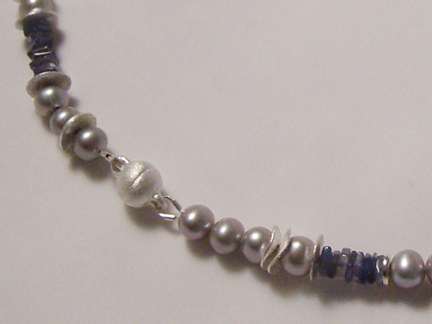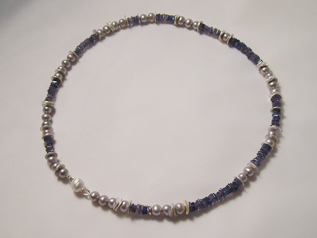 Graue Süßwasserzuchtperlen mit quadratischen Iolithscheiben, Zwischenteile und Magnetschließe in Silber.