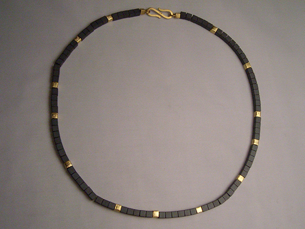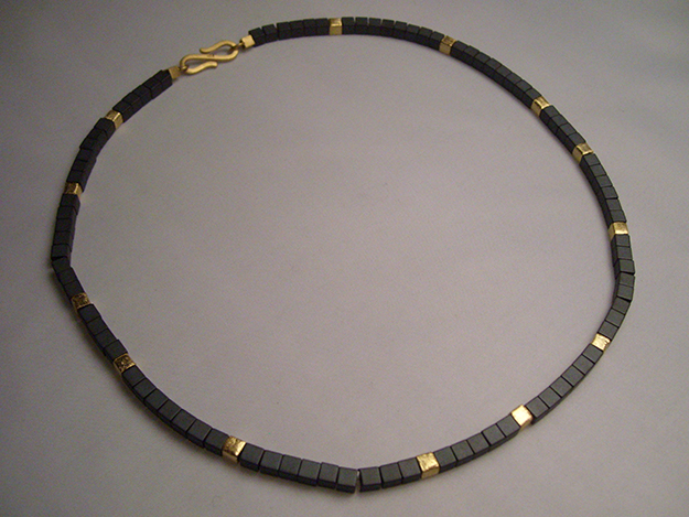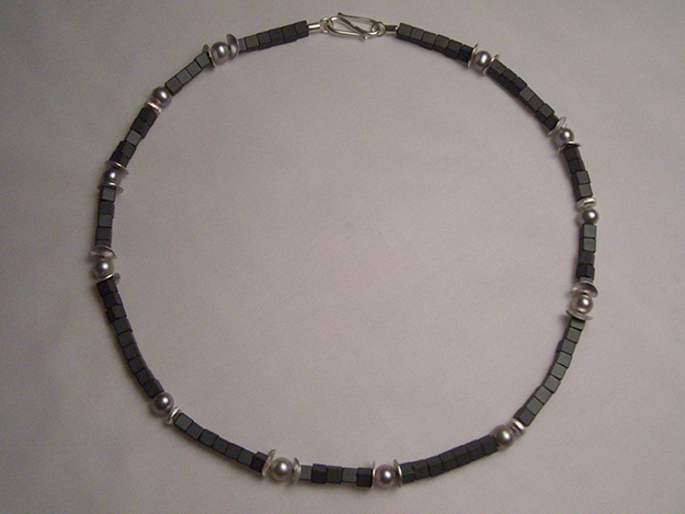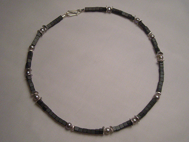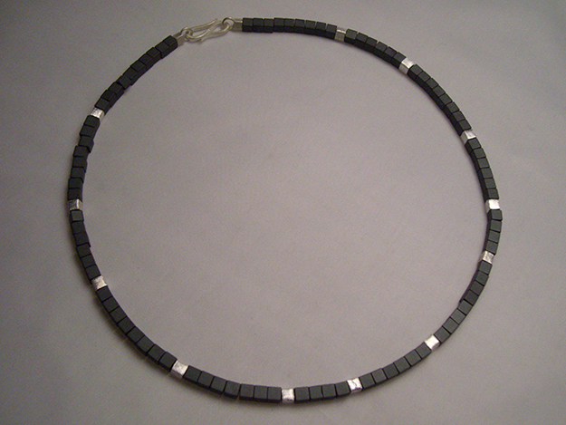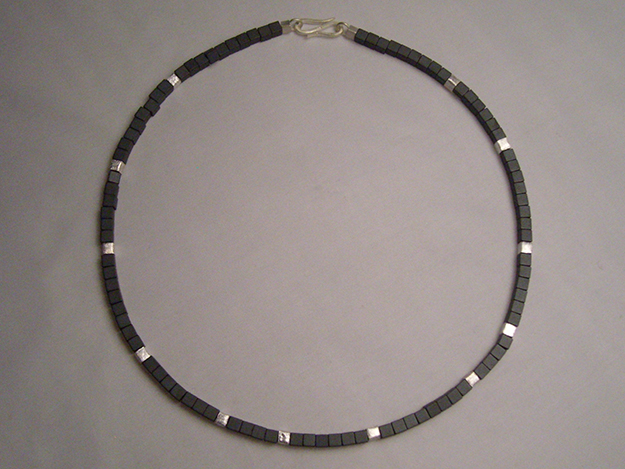 Würfel aus Hämatit, 4x4mm, mit Silberwürfeln und -schließe.