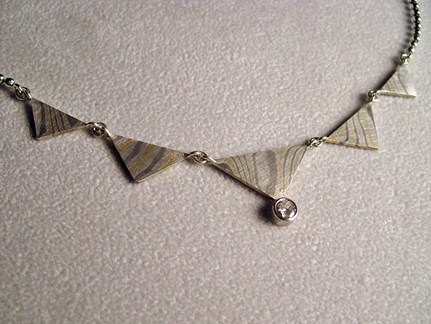 Kette in 925/000 Silber mit dreifarbigen Mokume Gane Plättchen, 917/000 Gelbgold, 950/000 Palladium und 935/000 Silber. mit Zargenfassung für Brillant.