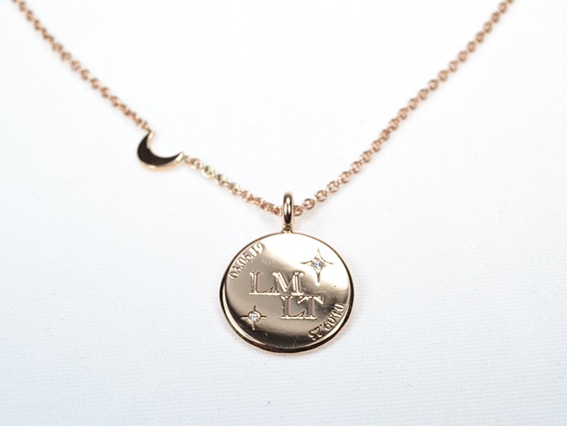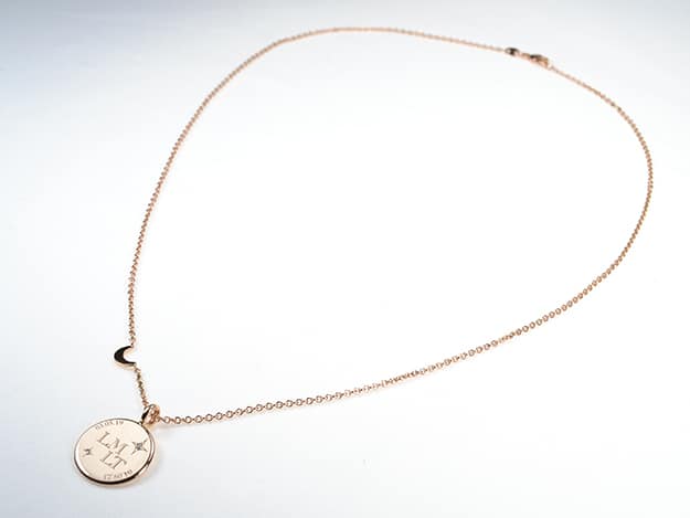 Diese Kette in 585/000 Rotgold hat einen Anhänger, einen fest zwischengesetzten Mond und allerhand Symbolik!