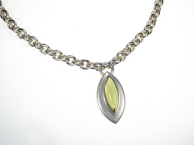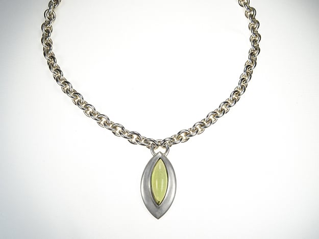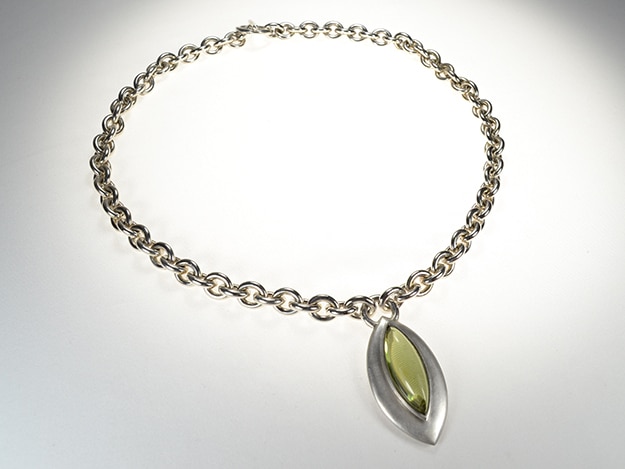 Schwere Kette in Ankerfacon mit massivem Anhänger, der einen grünen Berstein im Navetteschliff enthält.