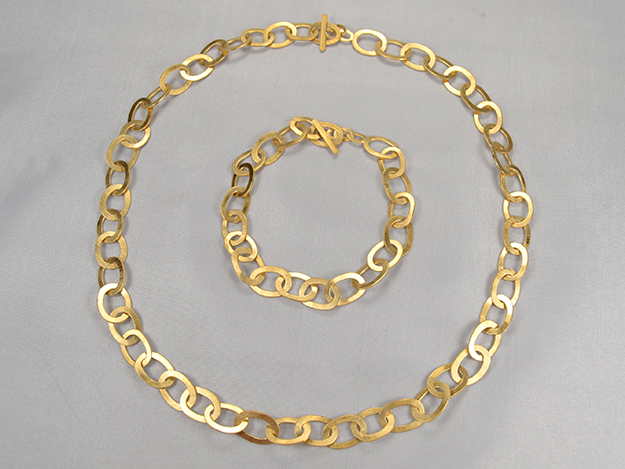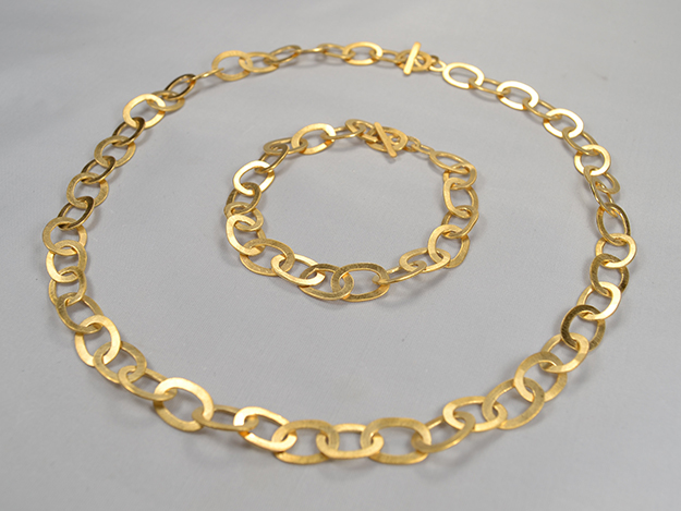 Ovale, handgefertigte ausgeschmiedete Ösen in Silber, feingolplattiert als Kette und als Armband.