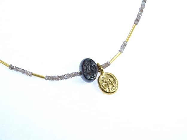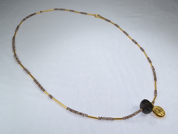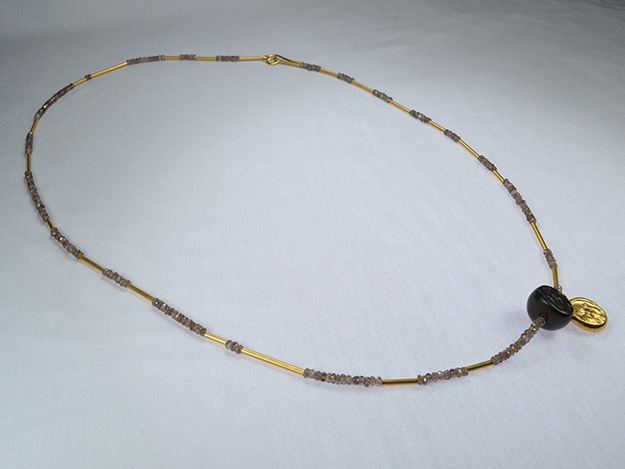 Lange Kette in braunem Zirkon und Zwischenteilen in feingoldplattiertem 925/000 Silber. Das Steinsiegel zeigt einen Engel und wird als sasanidisch, 5.-6. Jhdt. n. Chr. eingeordnet, einen Abdruck der Darstellung ist im Anhänger aus feingoldplattiertem 925/000 Silber zu sehen.