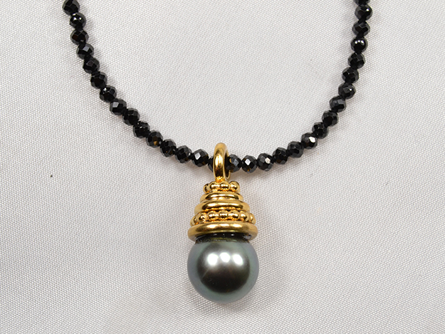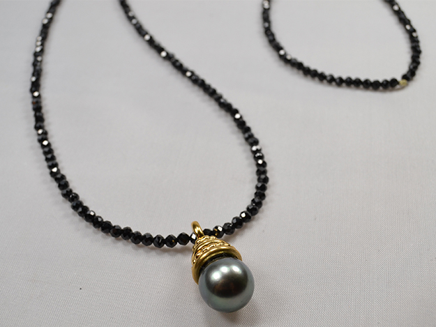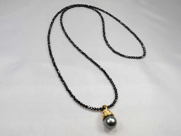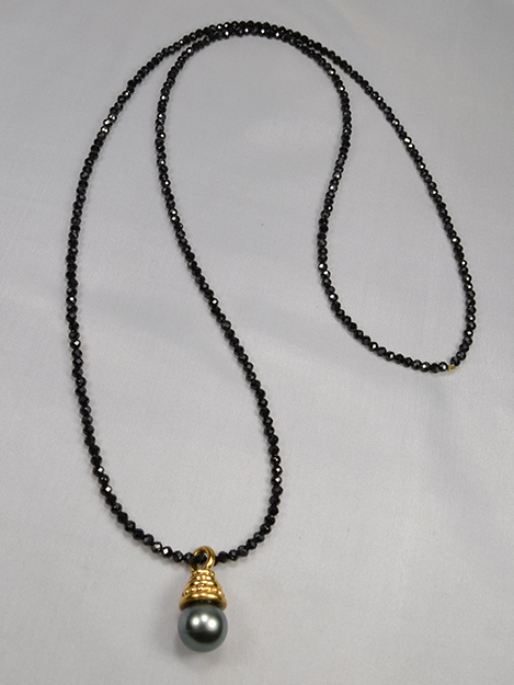 90cm lange Kette aus facettierten schwarzen Spinellkügelchen, 3mm Durchmesser, mit Anhänger aus Silber, feingoldplattiert mit Tahiti-Perle.