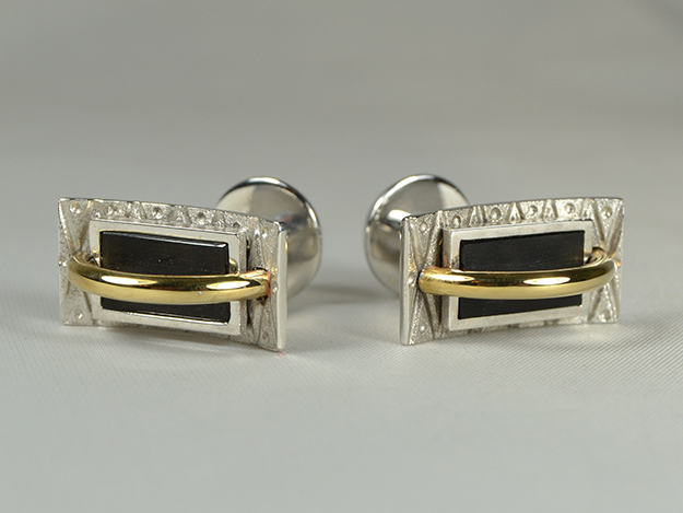 Manschettenknöpfe in 925/000 Silber und Gelbgold unter Verwendung eines Kundensteins. Fläche des silbernen Rechtecks mit eingefrästem Muster, darüber spannt sic ein Runddrahtbogen in 750/000 Gelbgold.