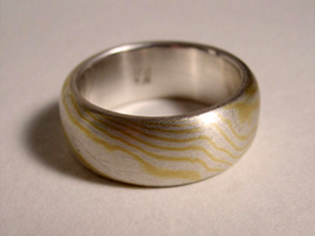 Breiter RIng in Mokume Gane 917/000 Gelbgold und 935/000 Silber, mit Silberinnenring.