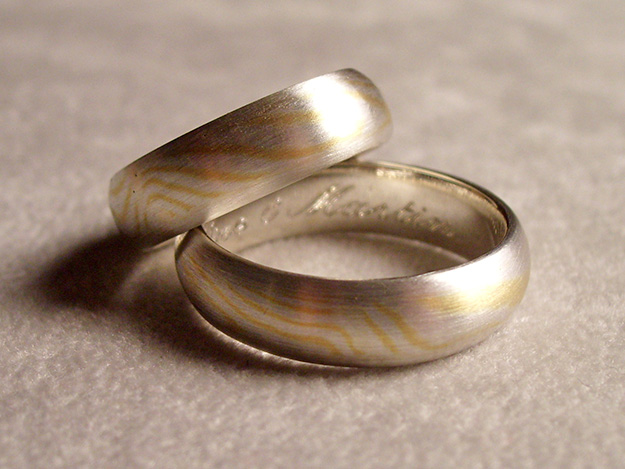 Mokume Gane Ringe in 917/000 Gelbgold und 935/000 Silber mit beidseitig angesetzten Silberstreifen