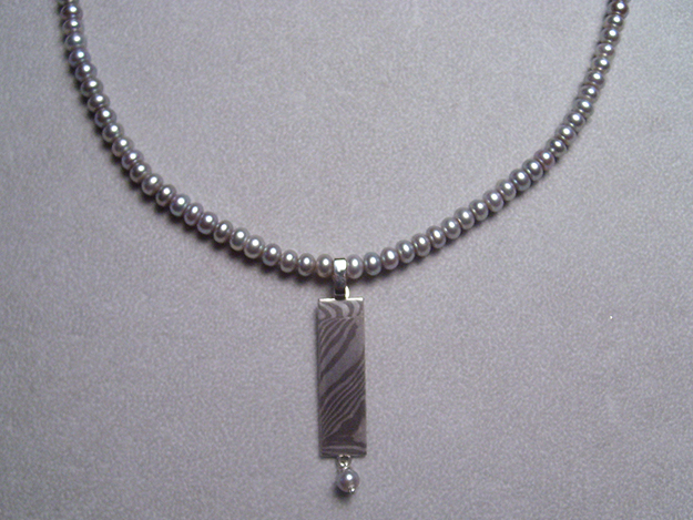 Süßwasserzuchtperlenkette mit Anhänger in Mokume Gane 500/000 Palladium und 935/000 Silber, tordiert.