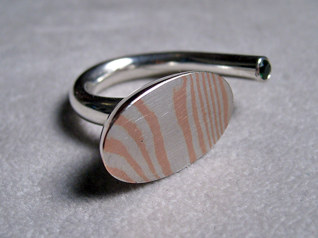 SRing in 925/000 SIlber mit Mokume Gane Platte in Feinsilber und Kupfer, tordiert, mit Tsavorit.