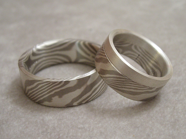 Trauringe in Mokume Gane, 935/000 Silber und 500/000 Palldium. Damenring ergänzt mit 925/000 Silberring.
