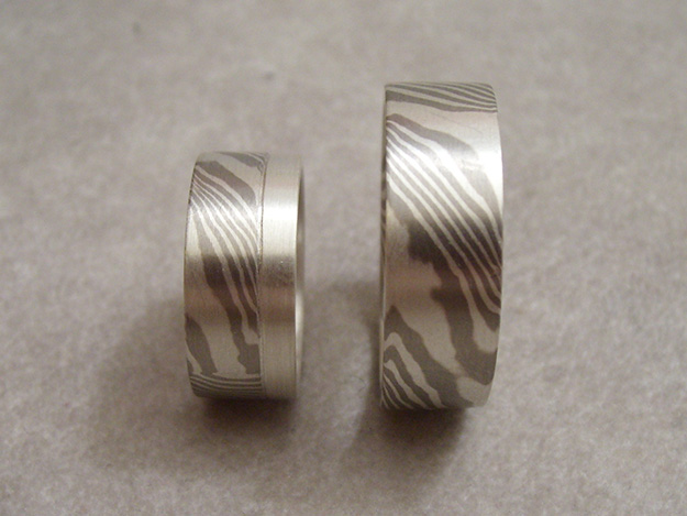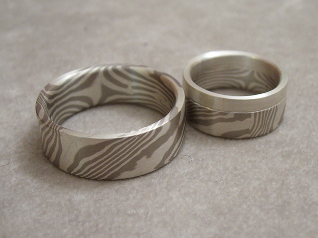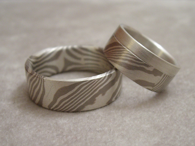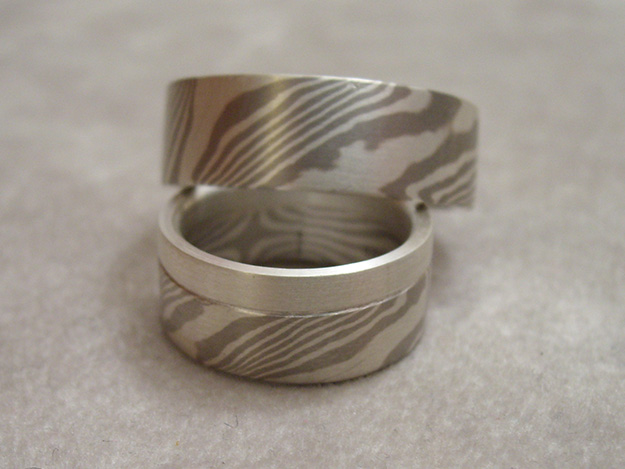 Trauringe in Mokume Gane Technik, 935/000 Silber und 500/000 Palladium. Damenring mit angesetztem Ring in 025/000n Silber.